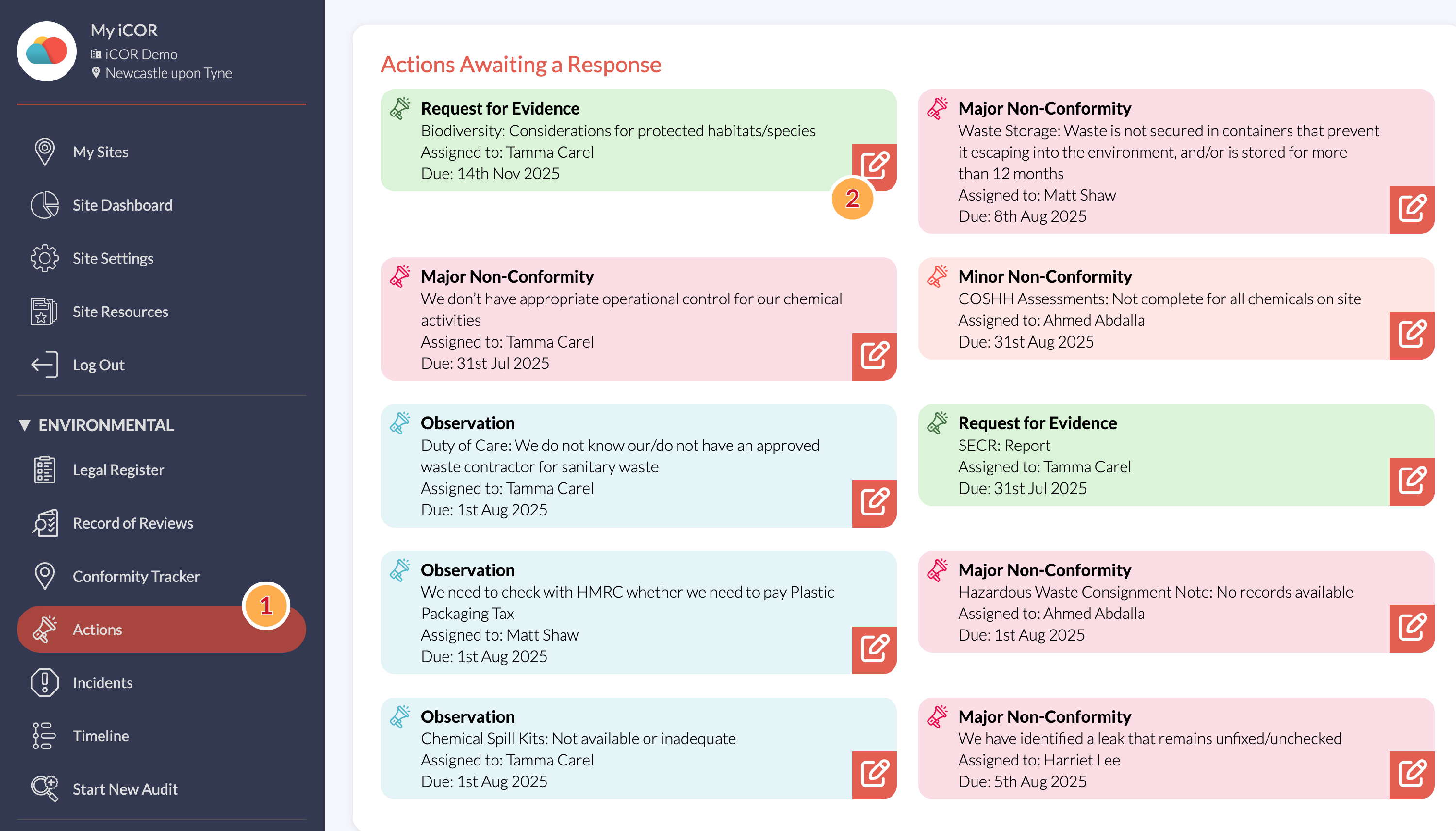 When an Audit Result has been assigned as an Action, they will appear in the Actions section, found on the left-hand menu (1).