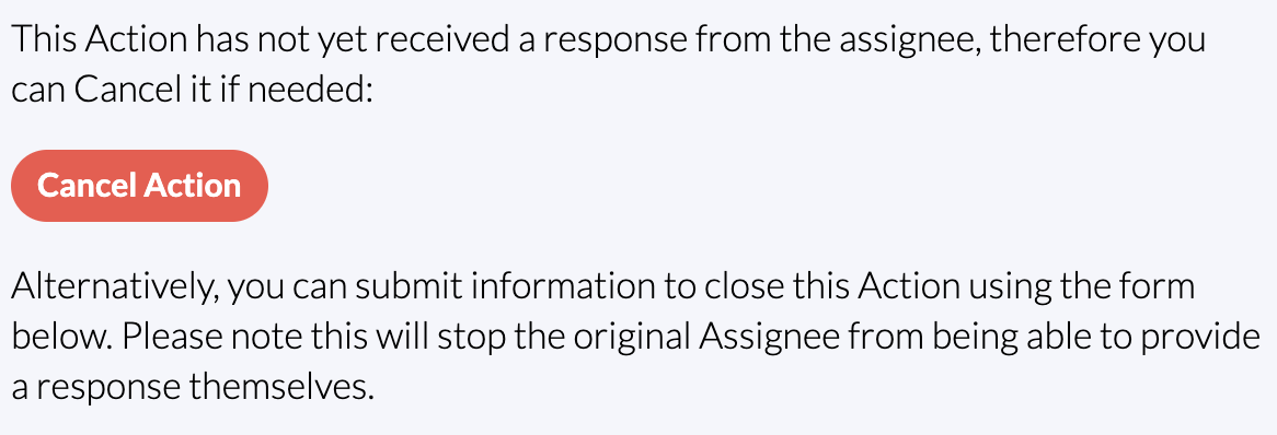 Site Controllers will have an additional option at the top of the page. If a mistake has been made, or the Action needs to be amended, or is no longer needed, it can be cancelled using this button, and then reassigned if necessary. |
