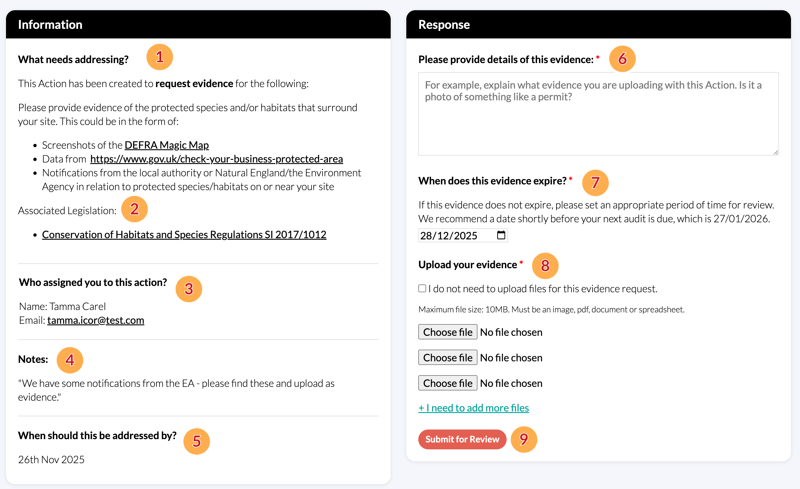 - When does this evidence expire? Setting an expiry date here means that this Request won't come up again in future audits until this date is reached. When it expires, the Request for Evidence will reappear in the Conformity Tracker and the Site Controller(s) will be notified. If it doesn't expire, please set an appropriate time for review of this evidence.