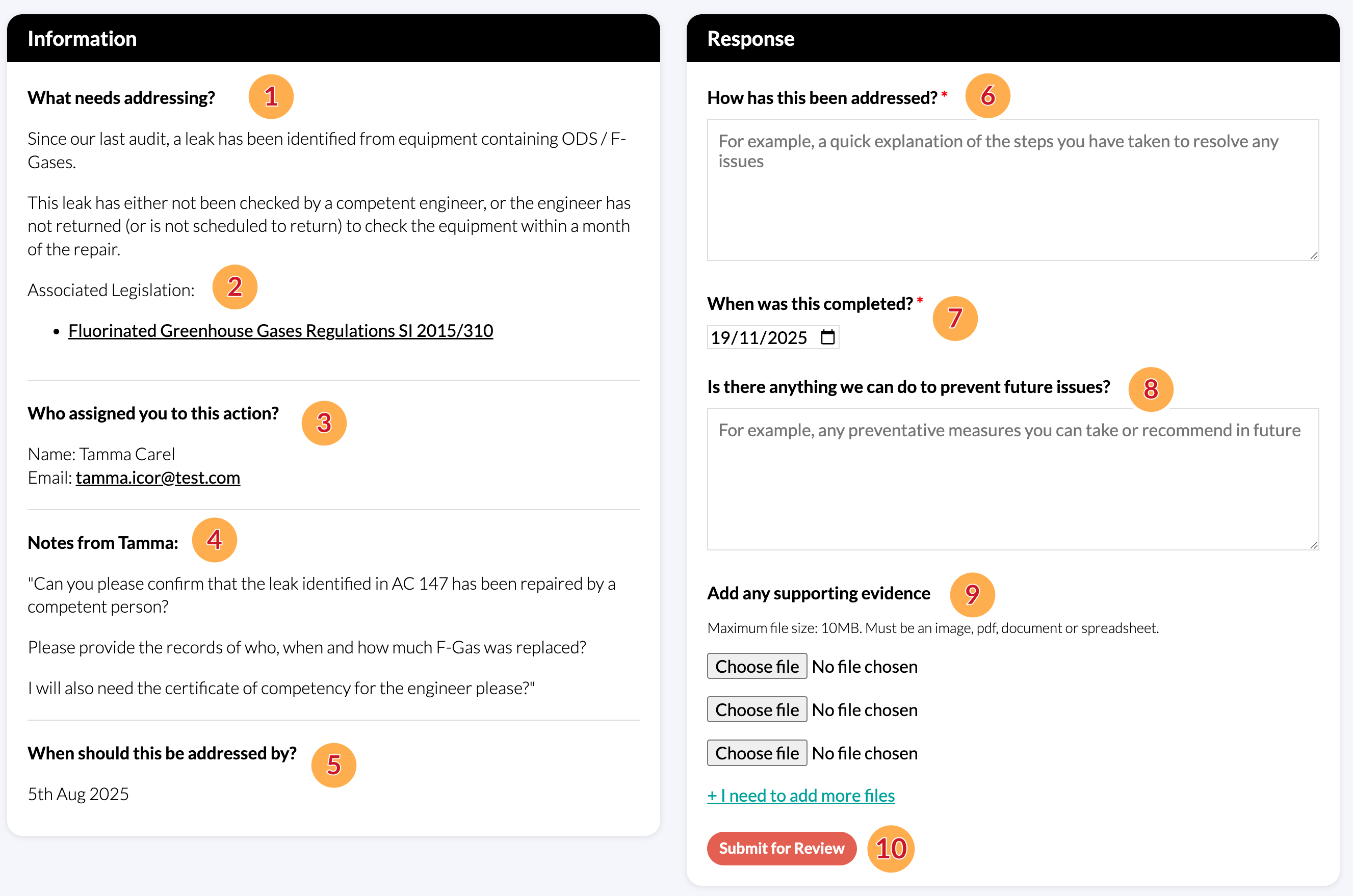A list of actions that require a response can be found on the Actions page under the Actions Awaiting a Response heading. Both Site Controllers and Colleagues who have been assigned to the action can respond to a Request for Evidence. They are broken down into two 'report cards' (Information and Response) that contain the following elements: