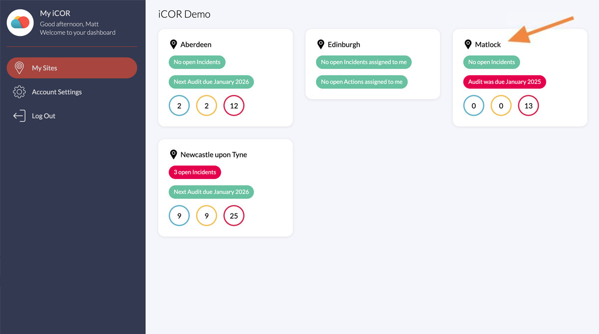 On the dashboard, select the site you wish to access. There may only be one site. If your site is not visible, check your user permissions, contact a company administrator, or contact iCOR support. (For this example, we are selecting the “Matlock” site)