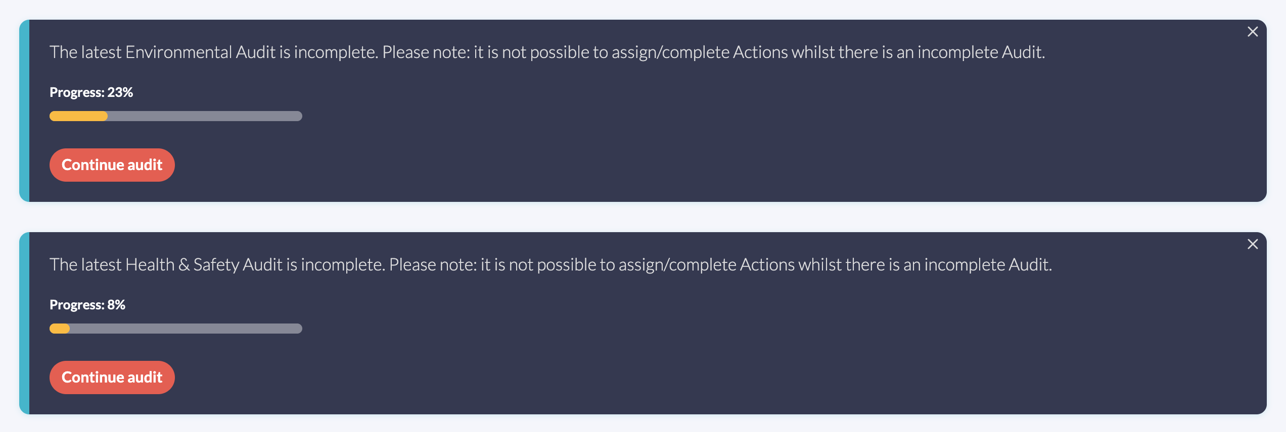 - If you click ‘Cancel Audit’, all your answers will be reset and you will have to start the audit again from the beginning.