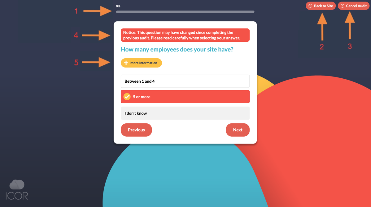 - You can click ‘Back to Site’ if you need to stop your audit, but plan to come back and pick up where you left off. iCOR will remember your progress.